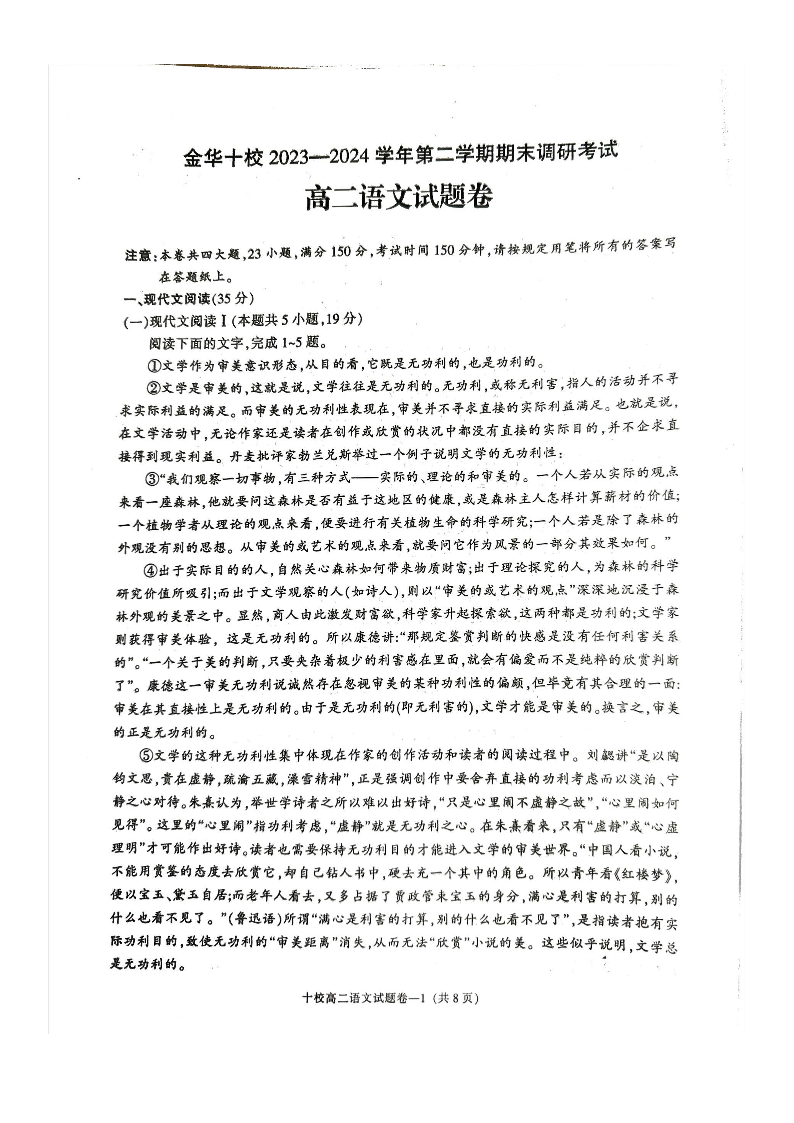 浙江省金华市金华十校2025届高二下学期期末联考考试 语文
