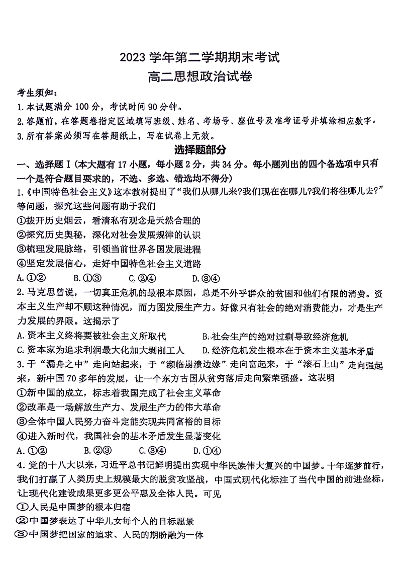 浙江省2025届浙江省宁波市慈溪市高二下学期期末考试 政治