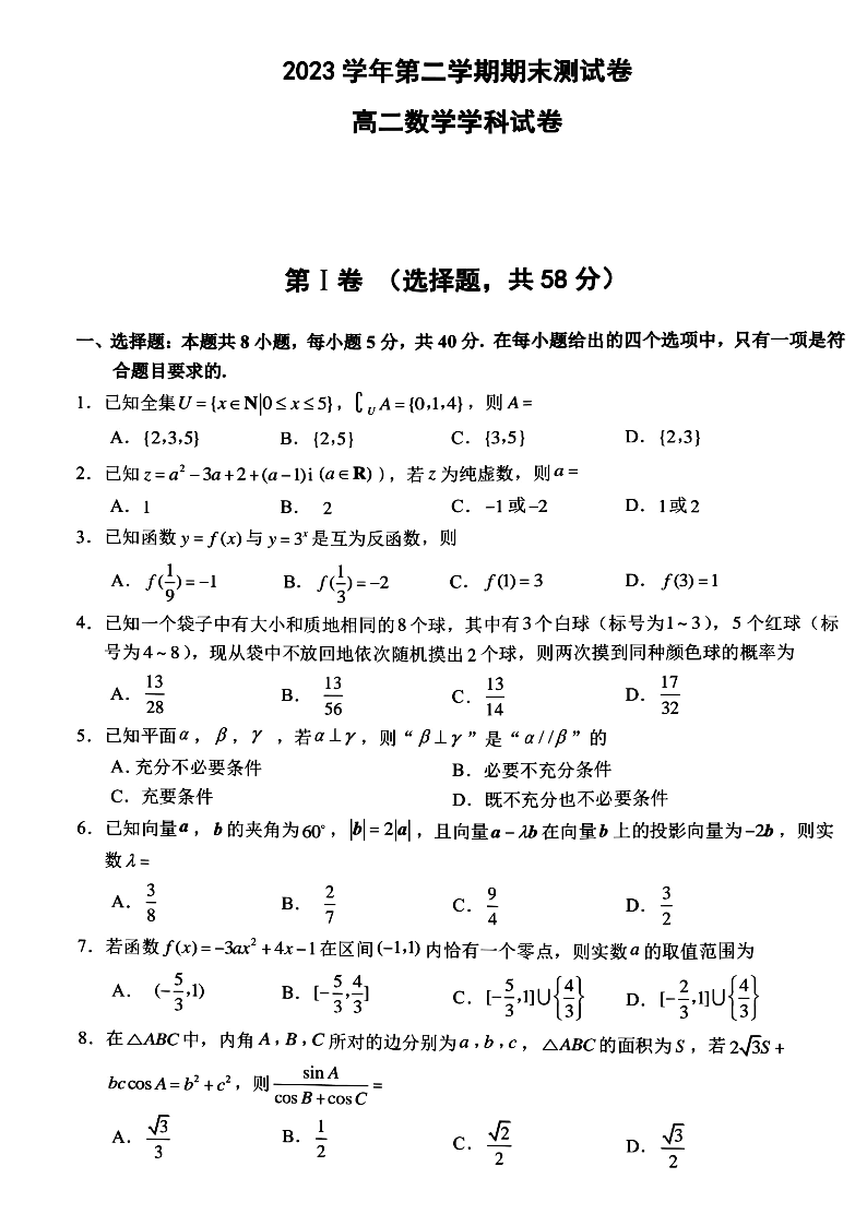 浙江省2025届浙江省宁波市慈溪市高二下学期期末考试 数学