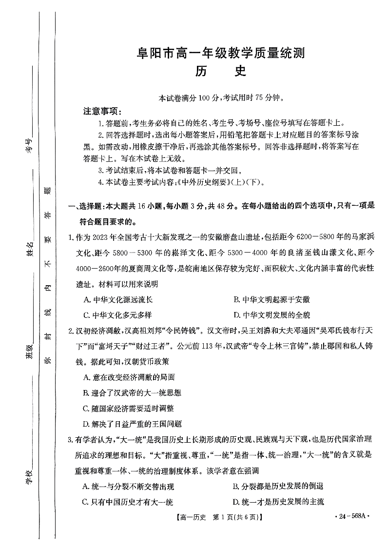 安徽省阜阳市2023-2024学年高一下学期7月期末质量统测 历史