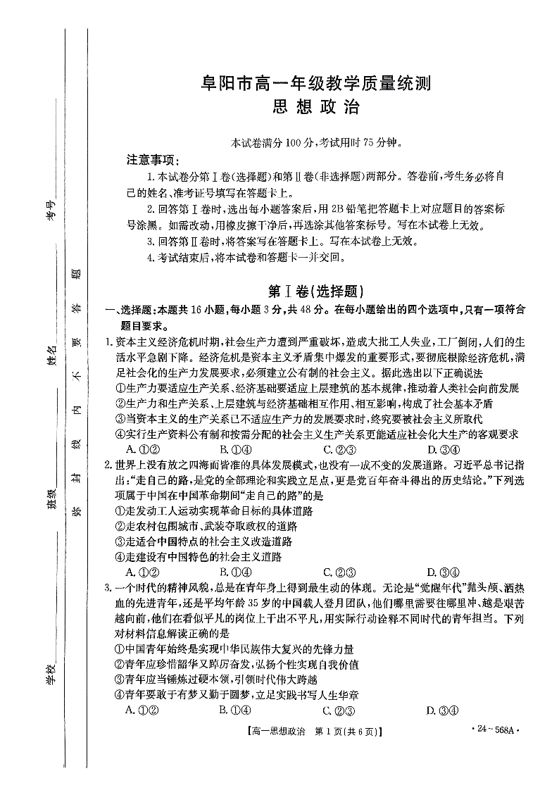 安徽省阜阳市2023-2024学年高一下学期7月期末质量统测 政治