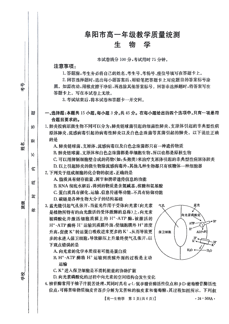 安徽省阜阳市2023-2024学年高一下学期7月期末质量统测 生物