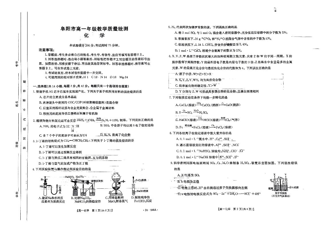 安徽省阜阳市2023-2024学年高一下学期7月期末质量统测 化学