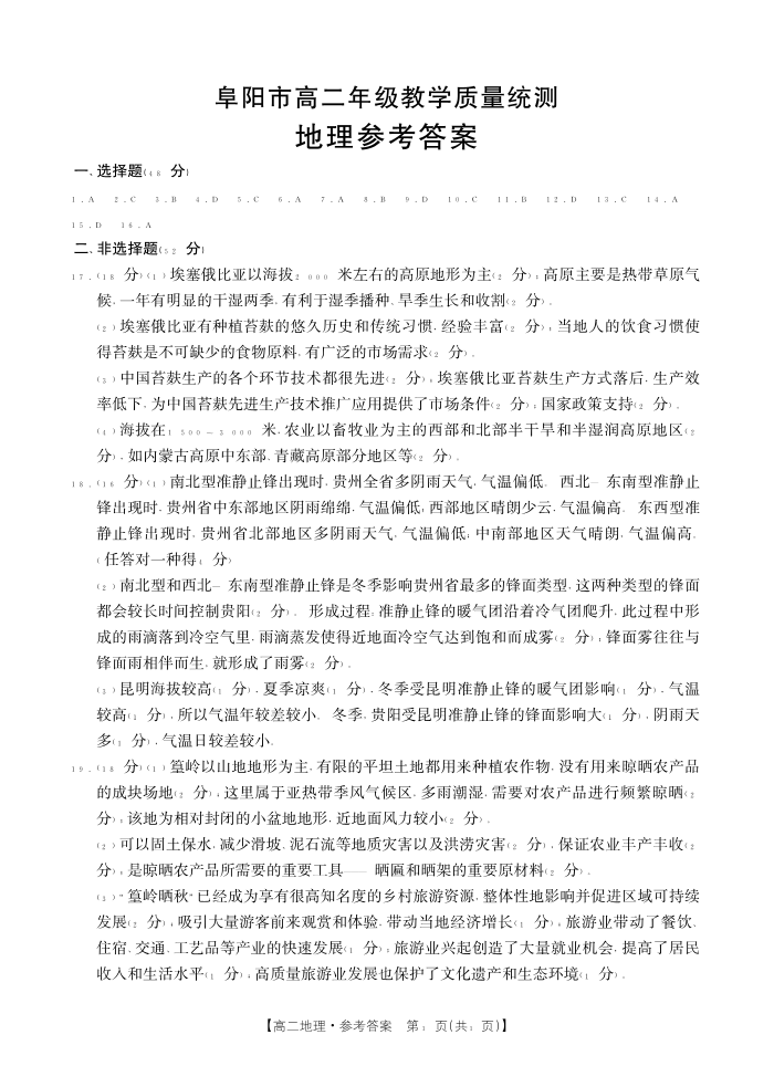 安徽省阜阳市2023-2024学年高二下学期期末教学质量统测 地理答案