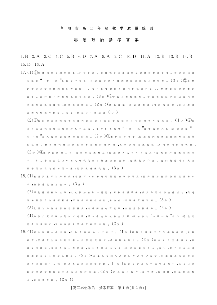 安徽省阜阳市2023-2024学年高二下学期期末教学质量统测 政治答案