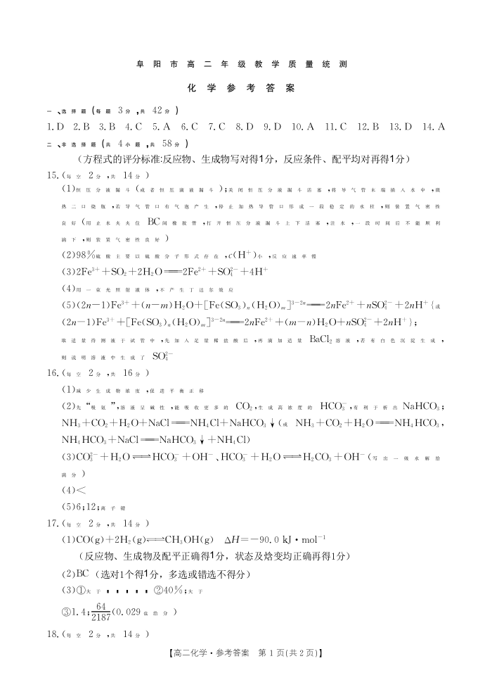 安徽省阜阳市2023-2024学年高二下学期期末教学质量统测 化学答案