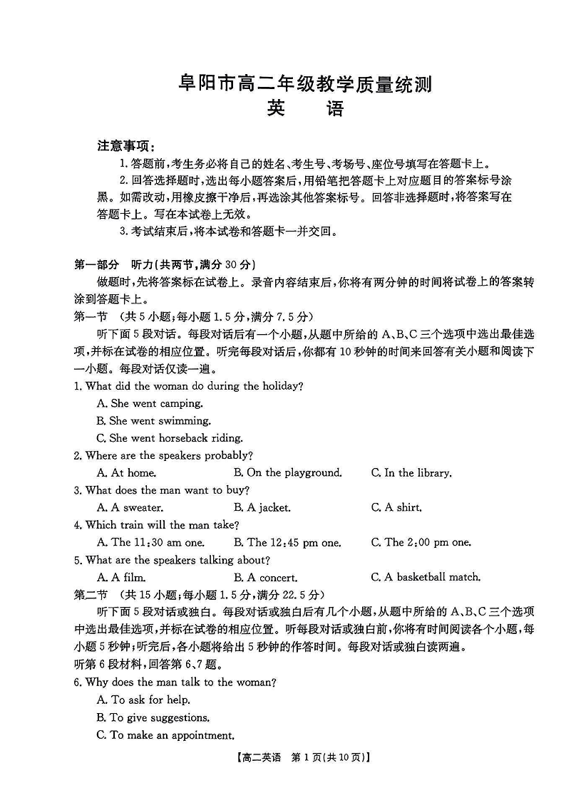 安徽省阜阳市2023-2024学年高二下学期期末教学质量统测 英语