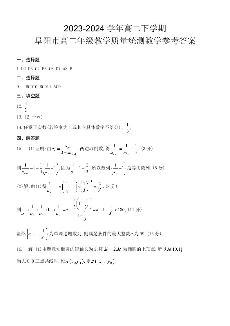 安徽省阜阳市2023-2024学年高二下学期期末教学质量统测 数学答案