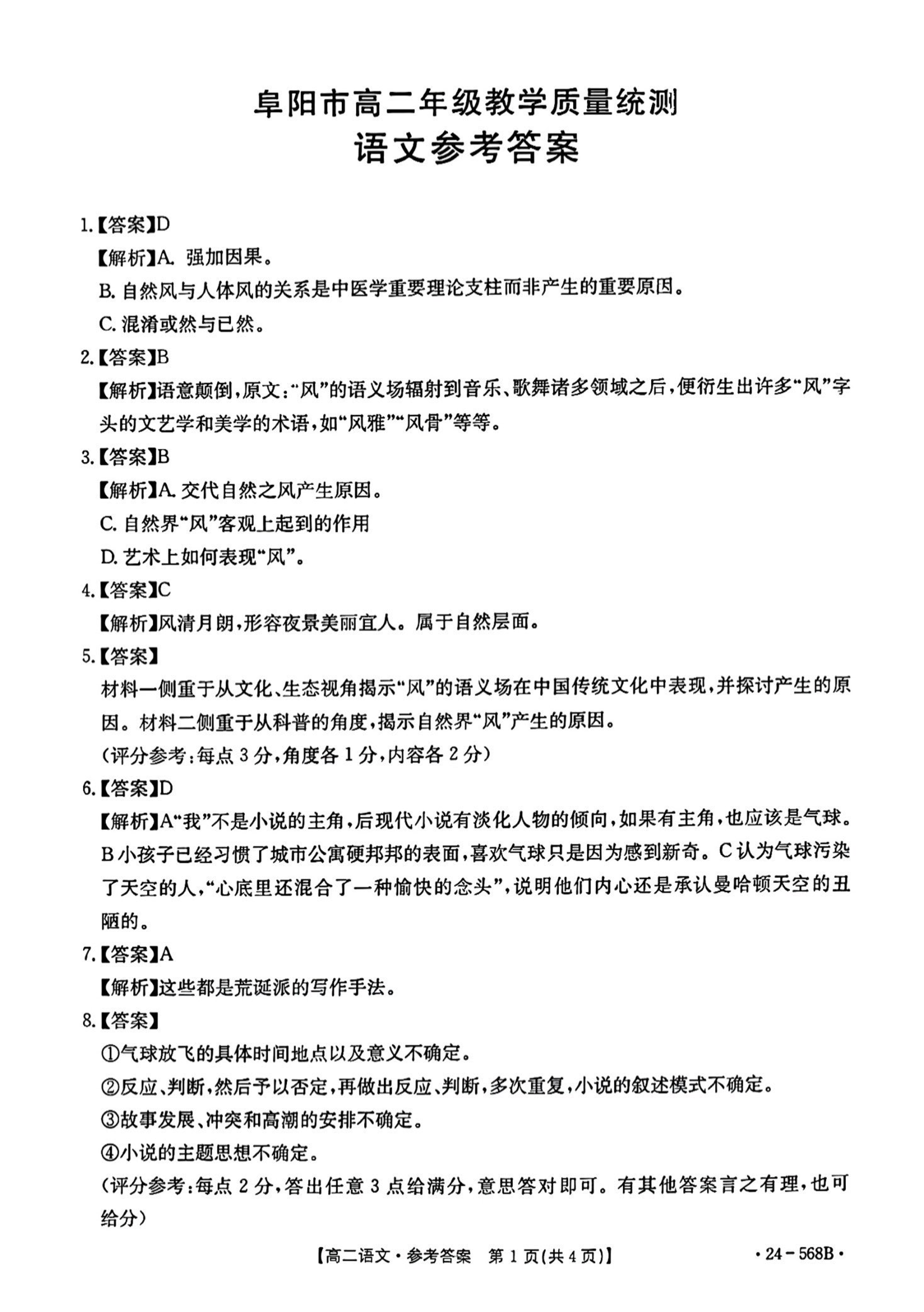 安徽省阜阳市2023-2024学年高二下学期期末教学质量统测 语文答案