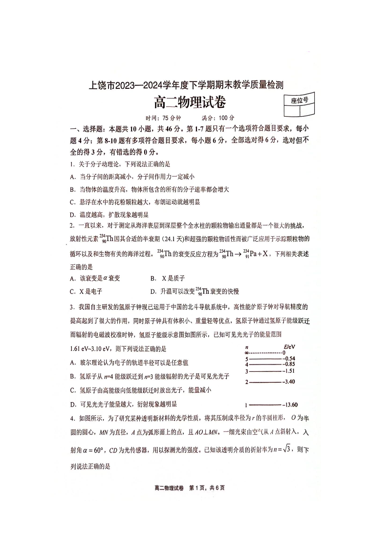 江西省上饶市2023-2024学年高二下学期期末教学质量检测 物理