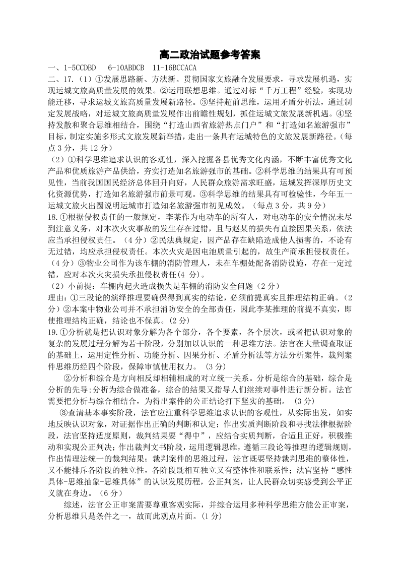 运城市2023—2024学年第二学期高二年级期末调研测试 政治答案