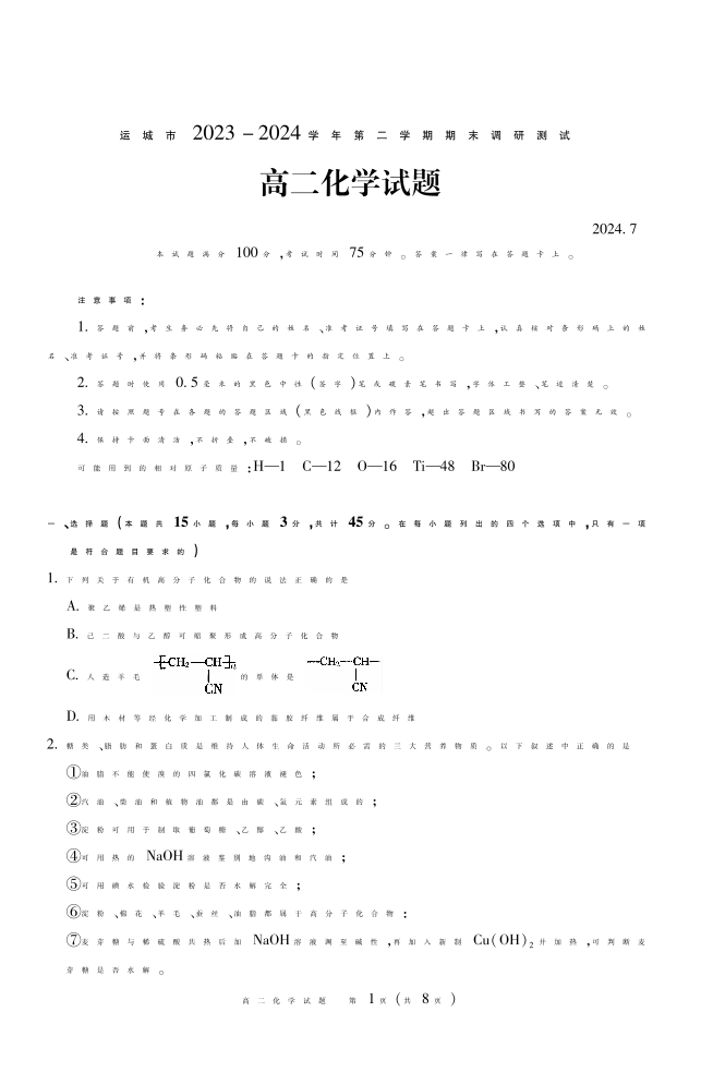 运城市2023—2024学年第二学期高二年级期末调研测试 化学