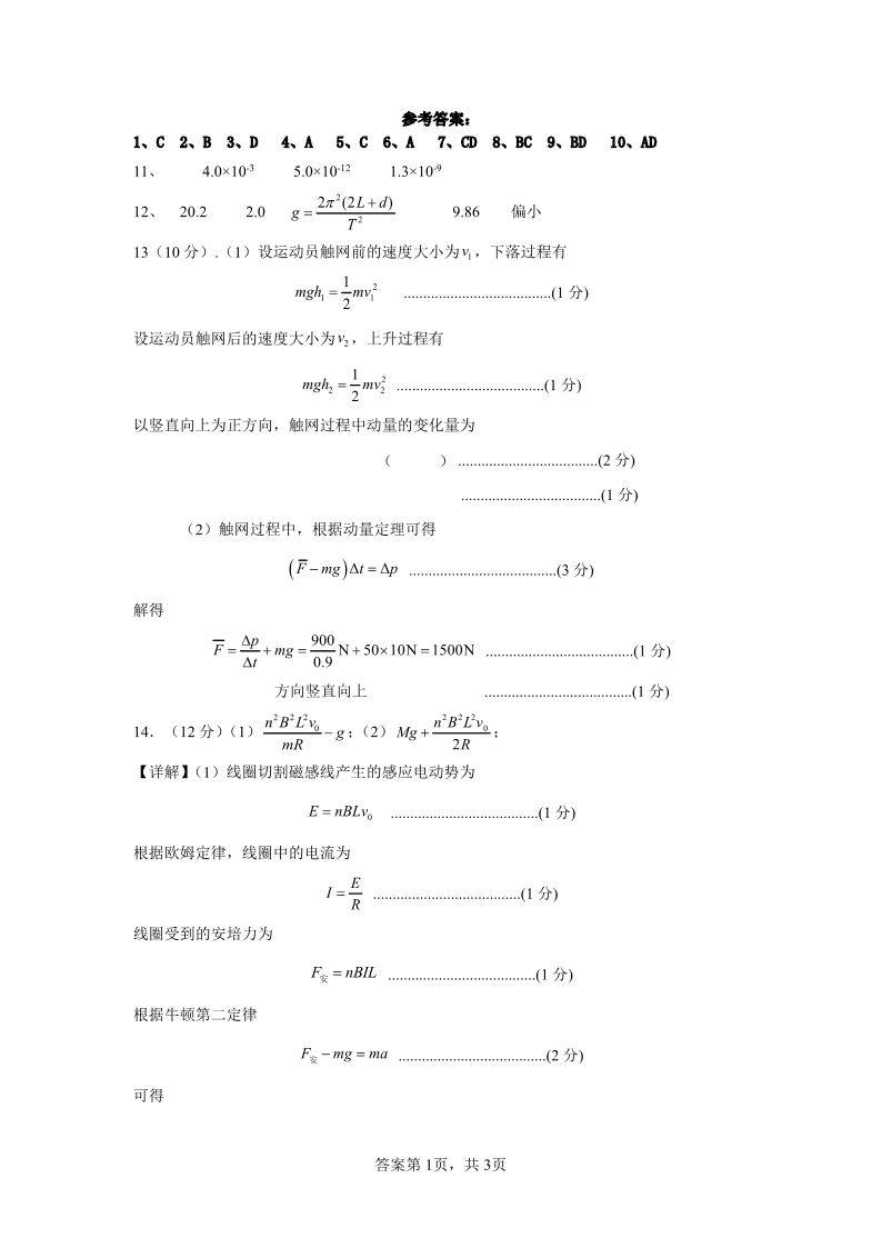 运城市2023—2024学年第二学期高二年级期末调研测试 物理答案