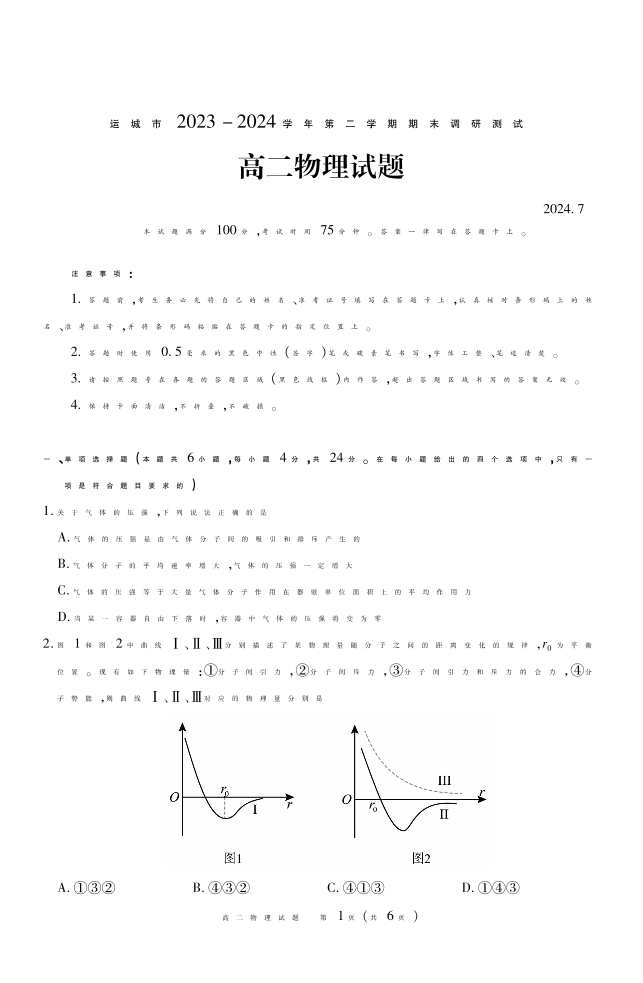 运城市2023—2024学年第二学期高二年级期末调研测试 物理