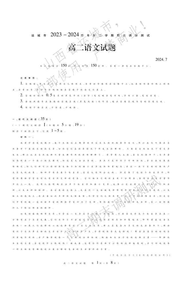 运城市2023—2024学年第二学期高二年级期末调研测试 语文