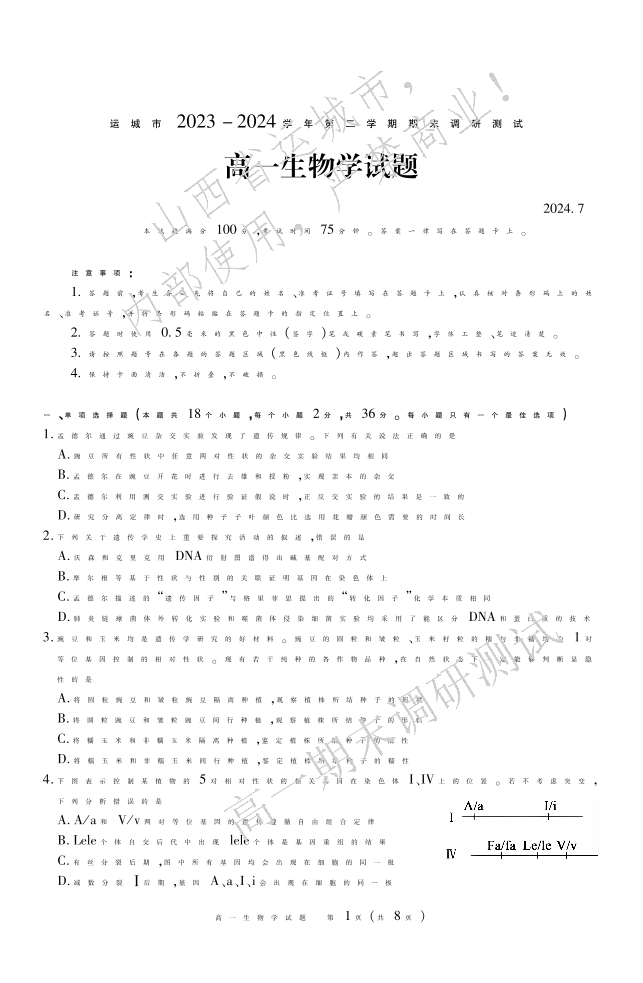 运城市2023—2024学年第二学期高一年级期末调研测试 生物