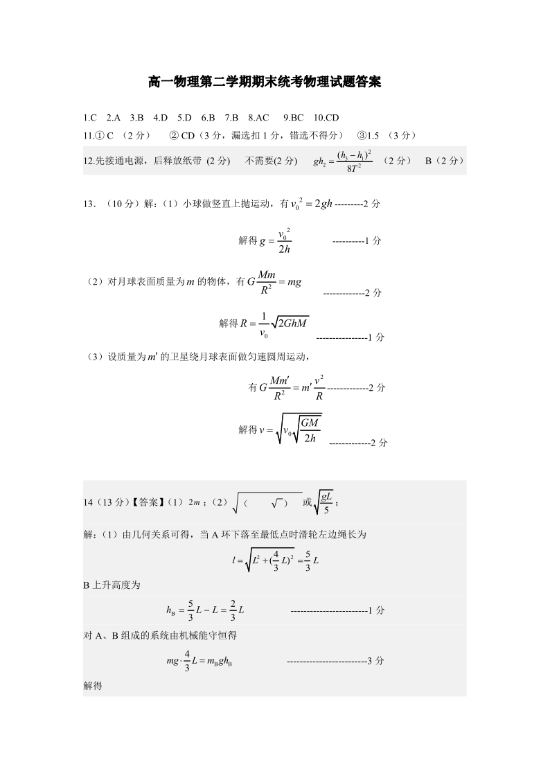 运城市2023—2024学年第二学期高一年级期末调研测试 物理答案