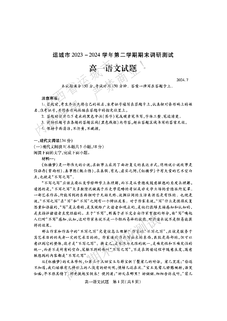 运城市2023—2024学年第二学期高一年级期末调研测试 语文