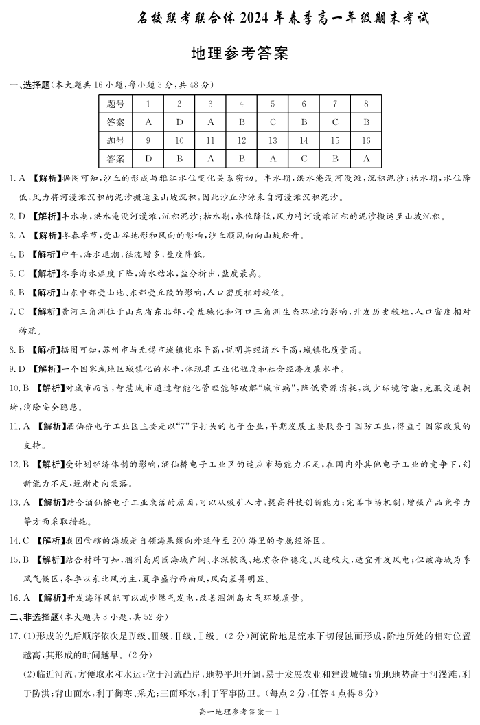 湖南省名校联考联合体2023-2024学年高一下学期期末考试 地理答案