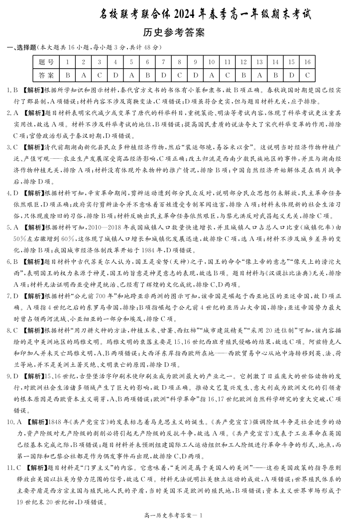 湖南省名校联考联合体2023-2024学年高一下学期期末考试 历史答案