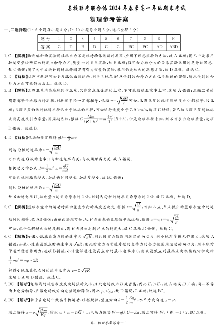湖南省名校联考联合体2023-2024学年高一下学期期末考试 物理答案