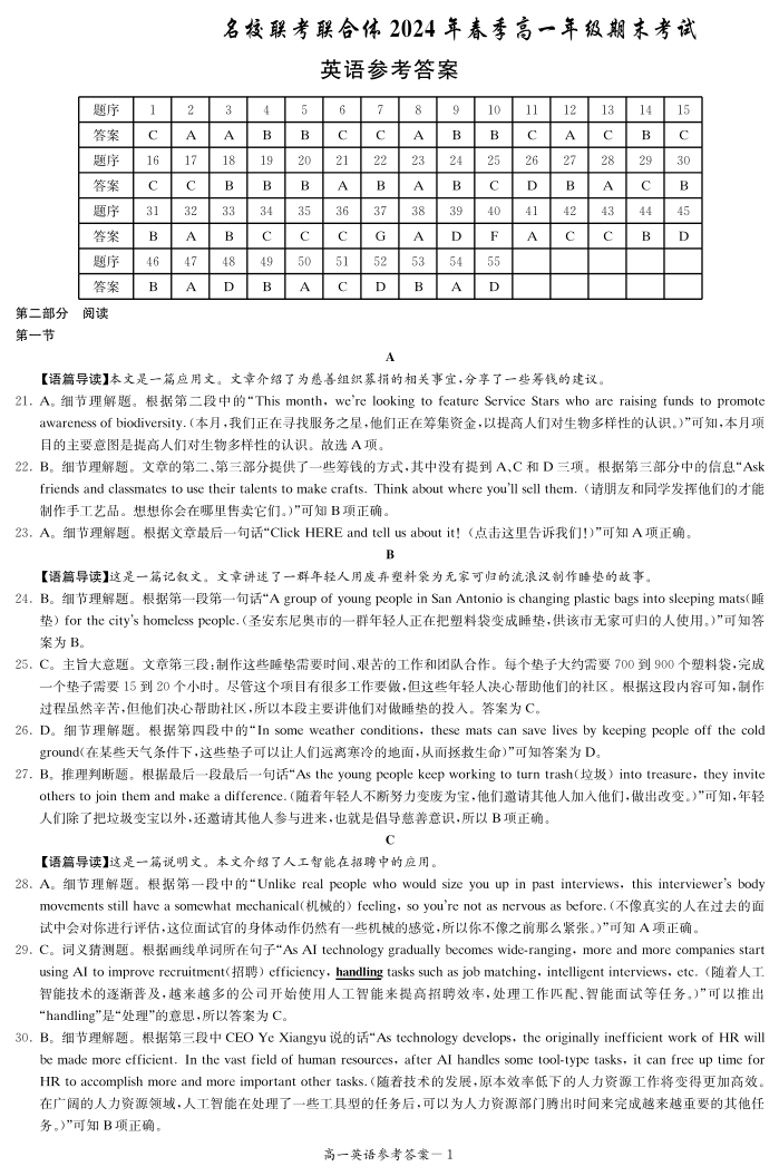 湖南省名校联考联合体2023-2024学年高一下学期期末考试 英语答案