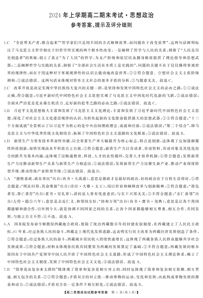 湖南省天壹大联考2023-2024年下学期高二期末联考 政治答案