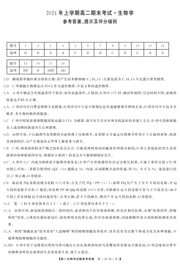 湖南省天壹大联考2023-2024年下学期高二期末联考 生物答案