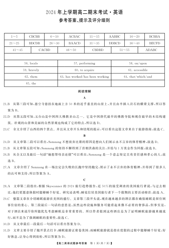 湖南省天壹大联考2023-2024年下学期高二期末联考 英语答案