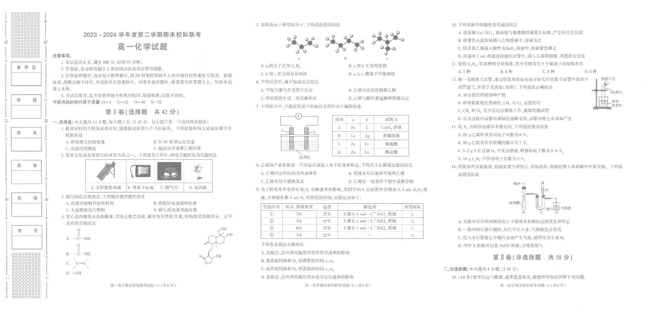 陕西省汉中市2023-2024学年高一下学期7月期末校际联考 化学