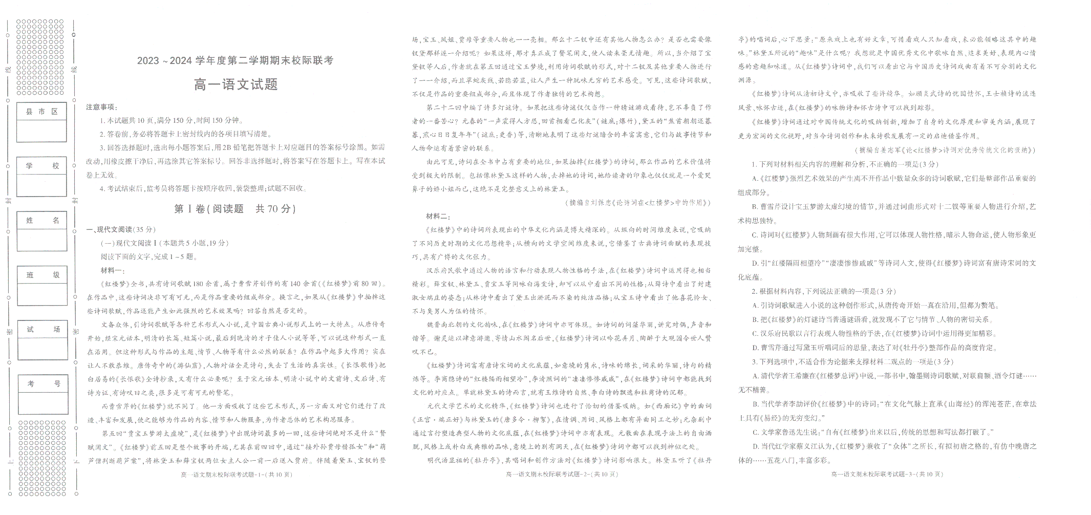 陕西省汉中市2023-2024学年高一下学期7月期末校际联考 语文