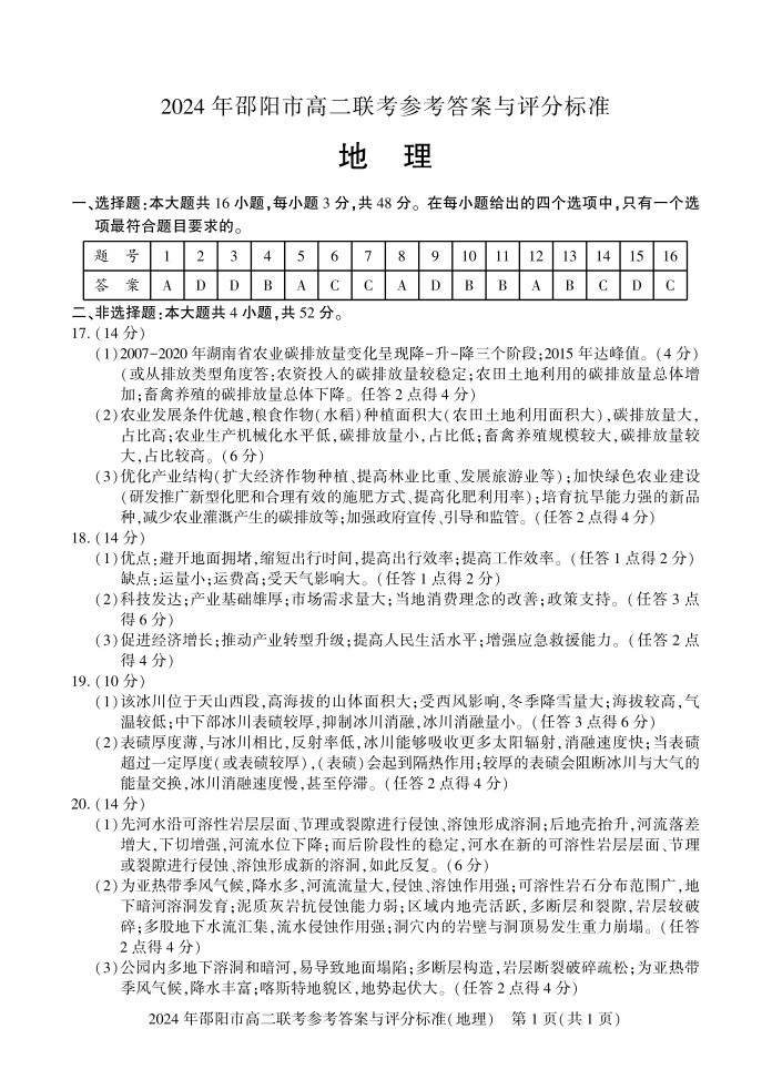 湖南省邵阳市2023-2024学年高二下学期7月期末 地理答案