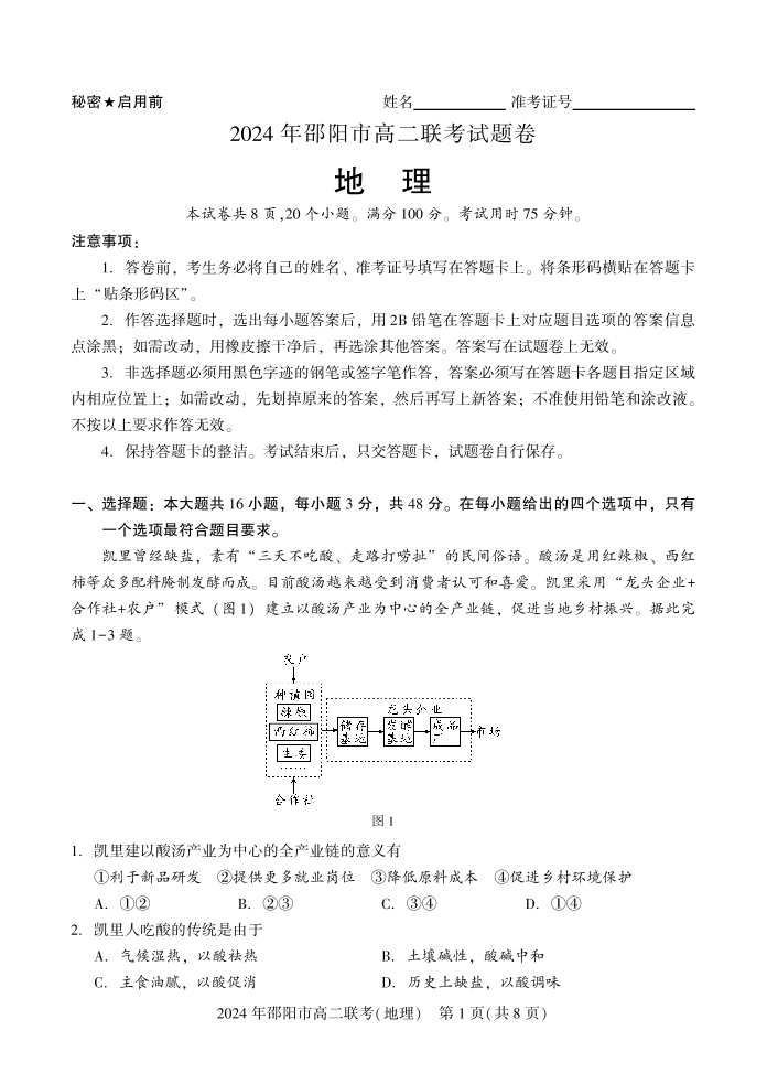 湖南省邵阳市2023-2024学年高二下学期7月期末 地理