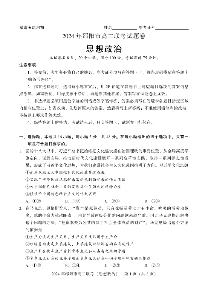 湖南省邵阳市2023-2024学年高二下学期7月期末 政治