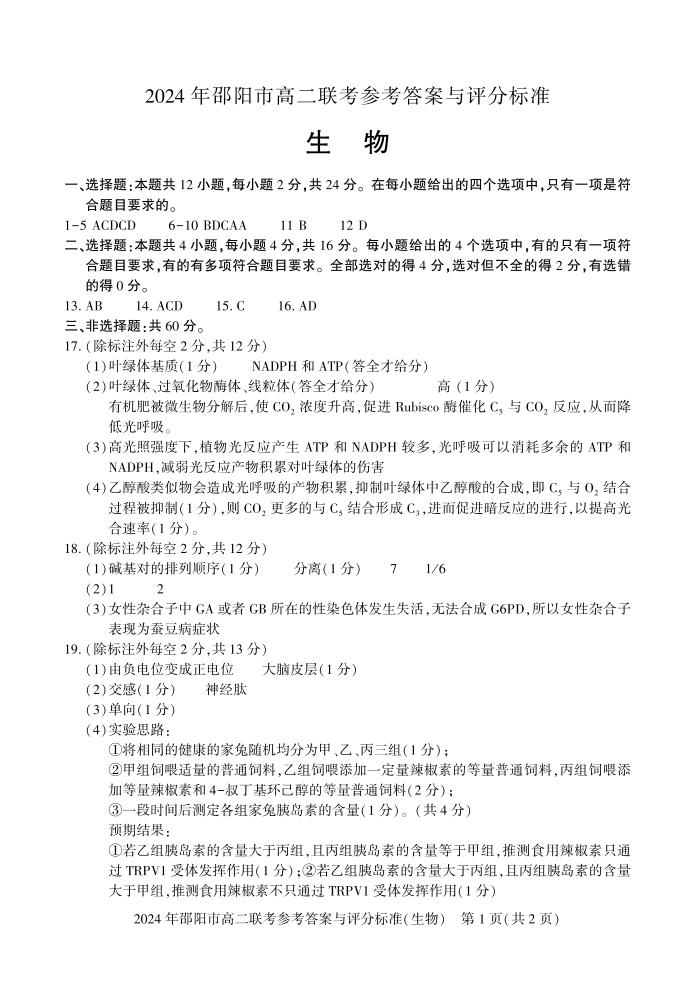 湖南省邵阳市2023-2024学年高二下学期7月期末 生物答案