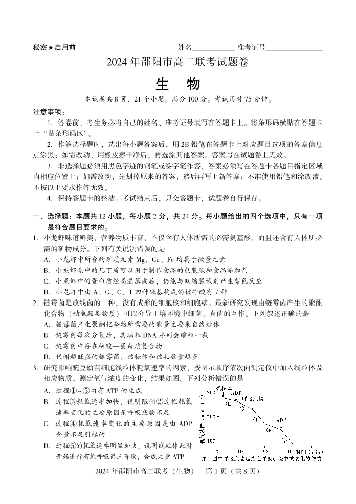 湖南省邵阳市2023-2024学年高二下学期7月期末 生物