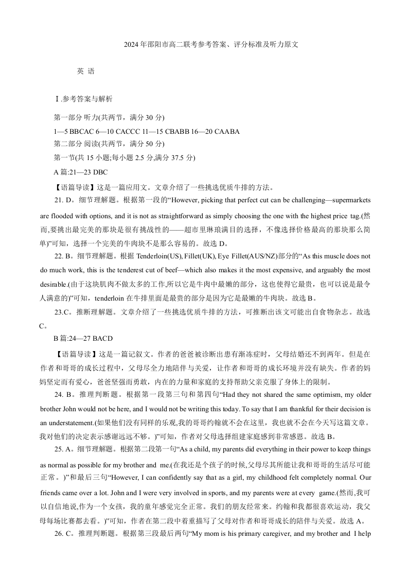湖南省邵阳市2023-2024学年高二下学期7月期末 英语答案