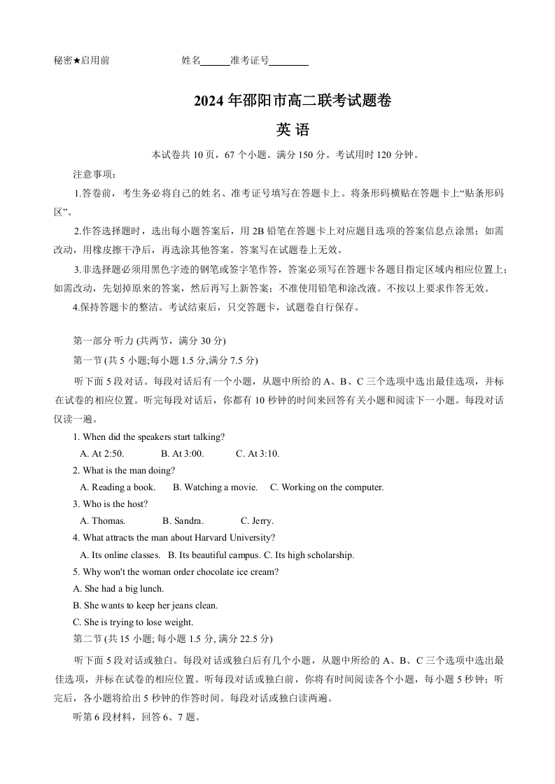 湖南省邵阳市2023-2024学年高二下学期7月期末 英语