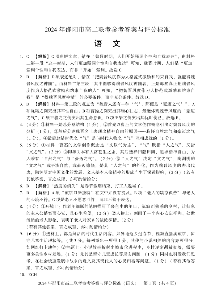 湖南省邵阳市2023-2024学年高二下学期7月期末 语文答案