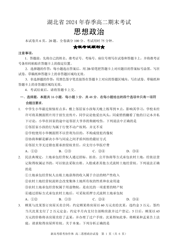 湖北省新高考联考协作体(八市)2023-2024学年高二下学期期末考试 政治