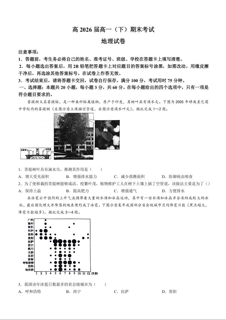 重庆市巴蜀中学校高2026届2024年高一下学期7月期末考试 地理