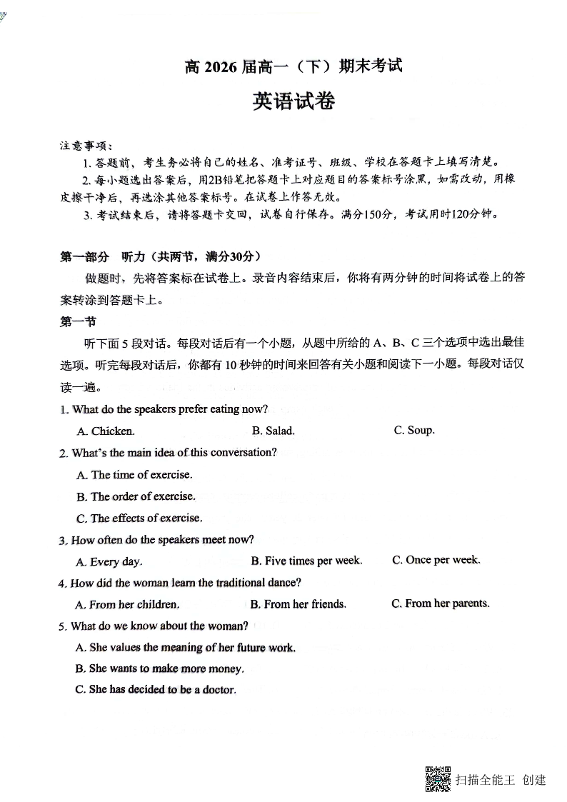重庆市巴蜀中学校高2026届2024年高一下学期7月期末考试 英语