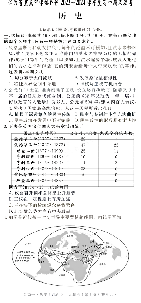 江西省重点中学协作体2023-2024学年高一下学期期末联考考试 历史