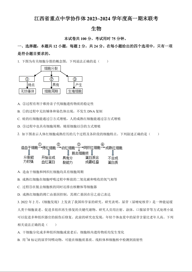 江西省重点中学协作体2023-2024学年高一下学期期末联考考试 生物