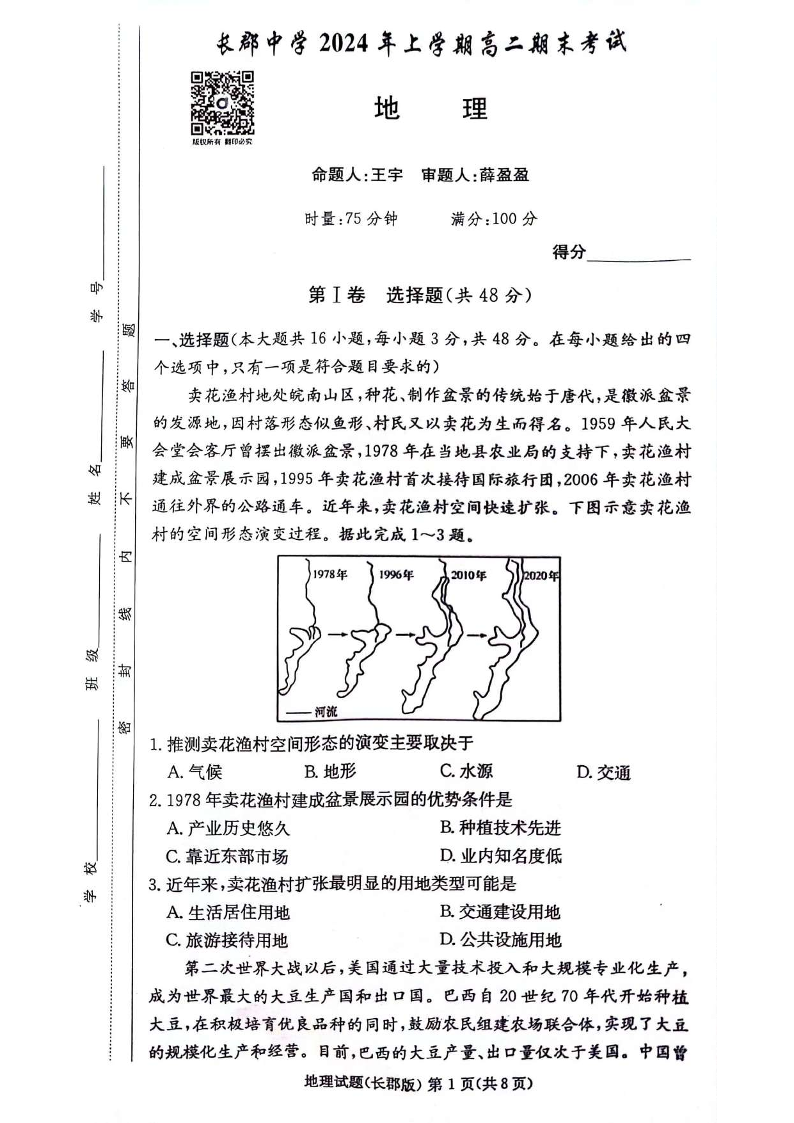 湖南省长沙市长郡中学2024年高二下学期期末考试 地理