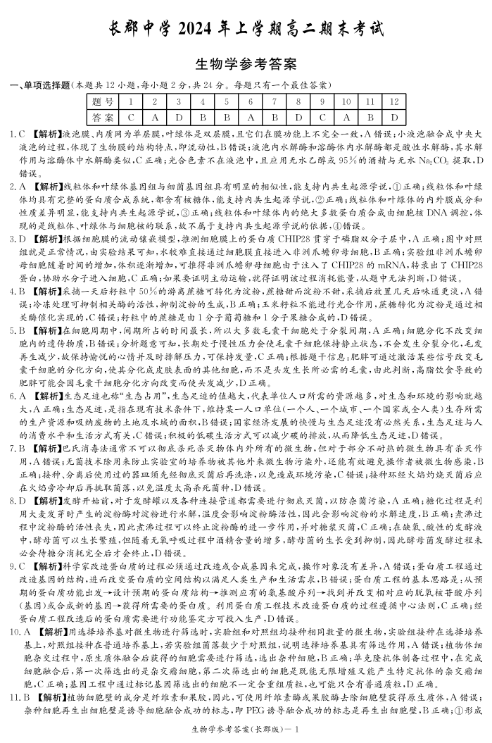湖南省长沙市长郡中学2024年高二下学期期末考试 生物答案