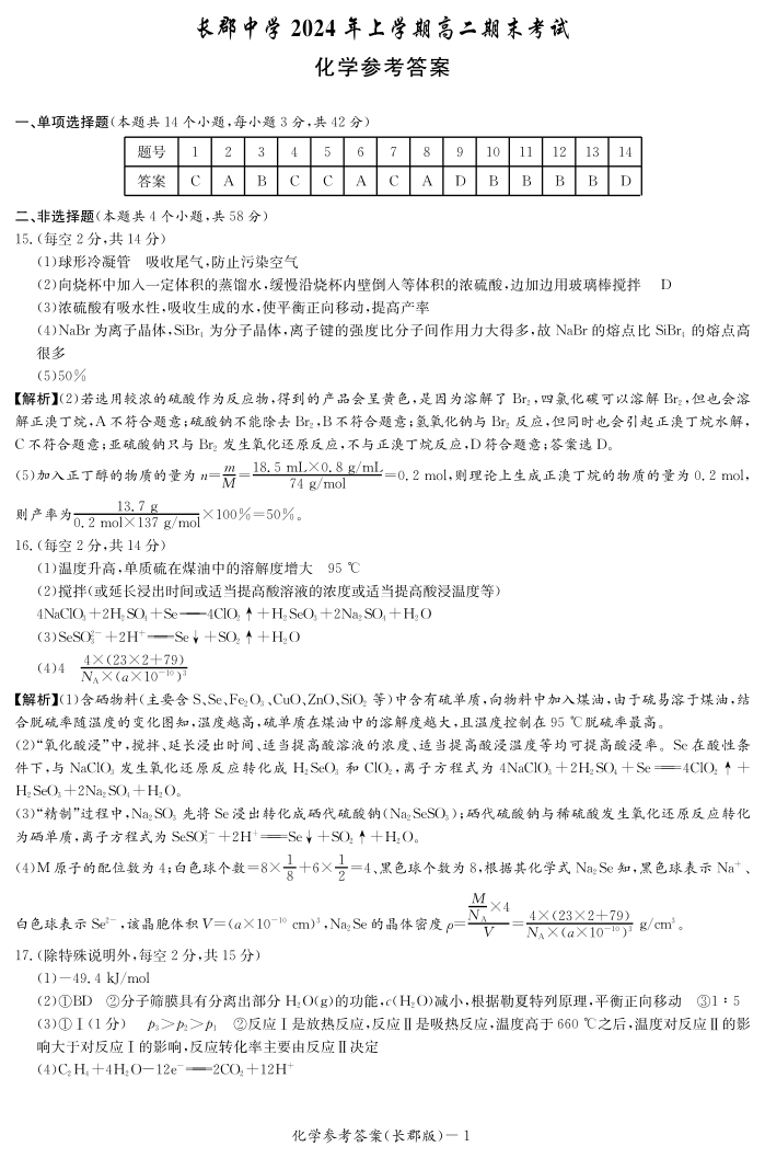 湖南省长沙市长郡中学2024年高二下学期期末考试 化学答案