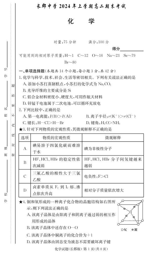 湖南省长沙市长郡中学2024年高二下学期期末考试 化学