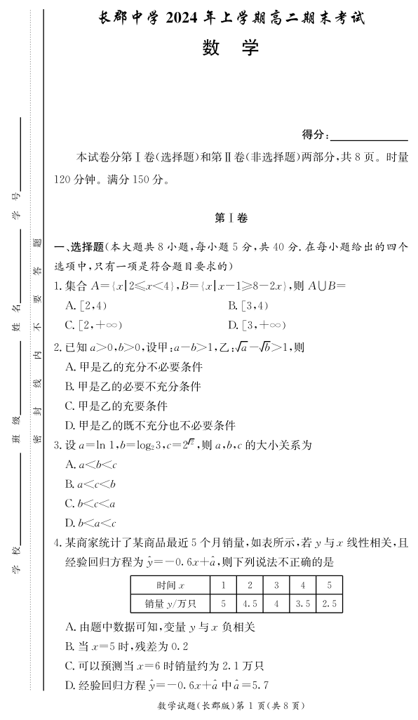 湖南省长沙市长郡中学2024年高二下学期期末考试 数学