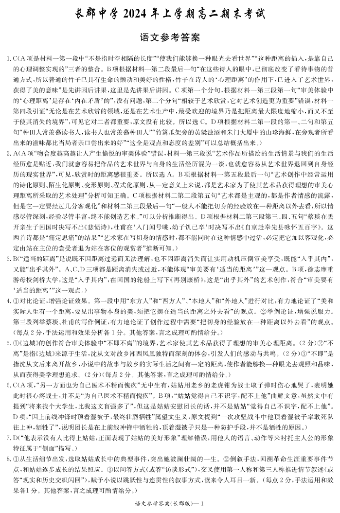 湖南省长沙市长郡中学2024年高二下学期期末考试 语文答案